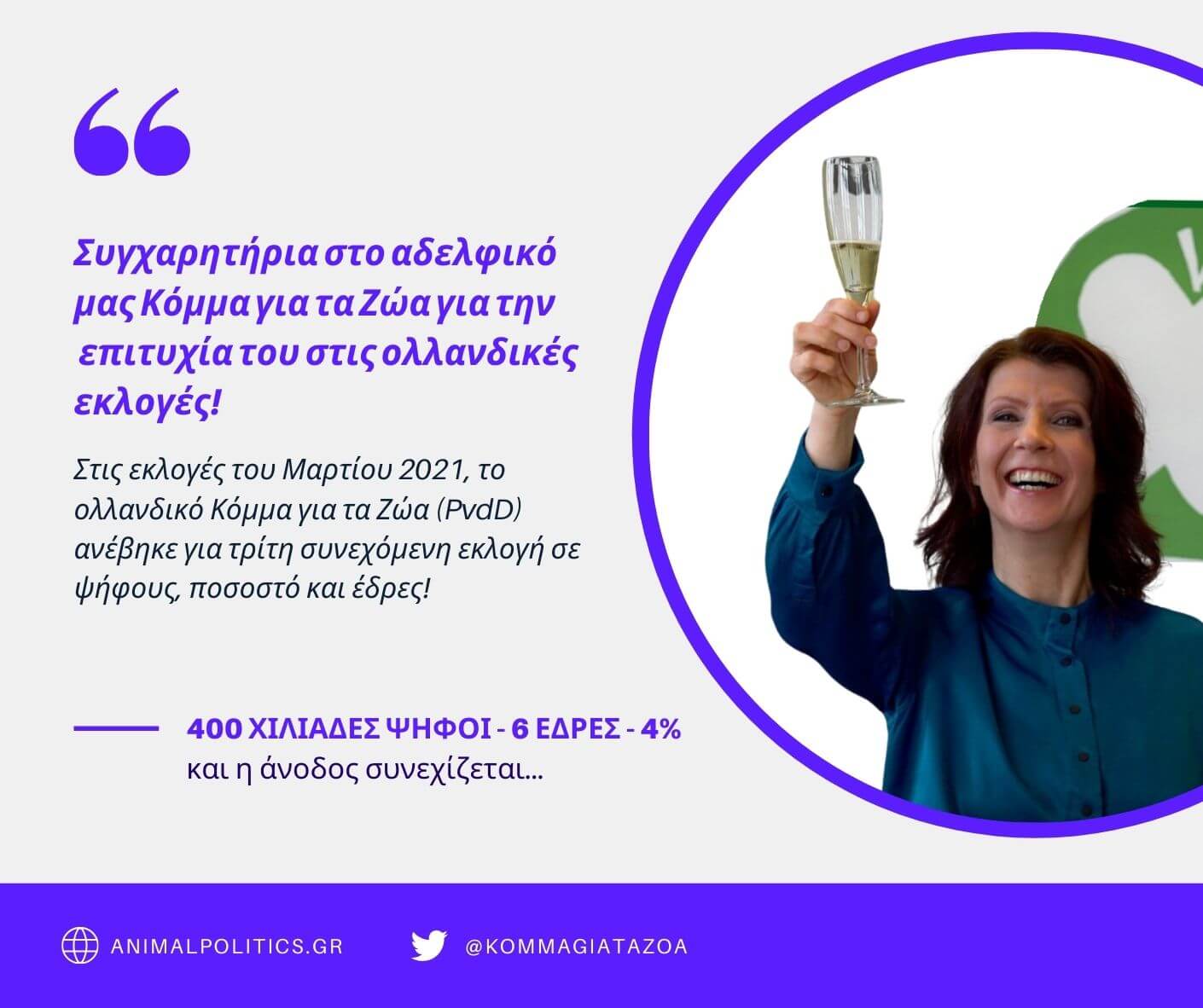 Οι σημαντικές εκλογικές επιτυχίες των φιλοζωικών κομμάτων στις πρόσφατες εκλογές στη Γερμανία και στην Ολλανδία, πιστοποιούν πως η Πολιτική Φιλοζωία ήρθε για να μείνει στην πολιτική.