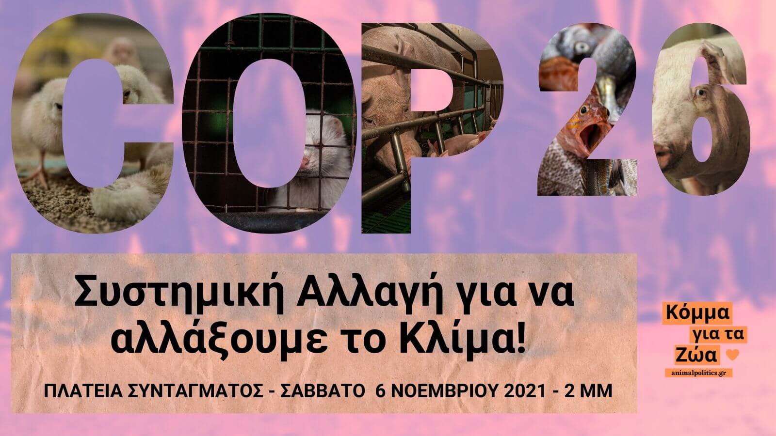 Το Σάββατο 6 Νοεμβρίου 2021, στις 2 μ.μ. θα βρεθούμε στην Πλατεία Συντάγματος, στο συντριβάνι εμπρός από την έξοδο του μετρό, για να συμμετέχουμε ως Κόμμα για τα Ζώα στην Παγκόσμια Ημέρα Δράσης για το Κλίμα, που θα διεξαχθεί ταυτόχρονα στην Αθήνα και σε εκατοντάδες άλλες πόλεις σε όλο τον κόσμο.