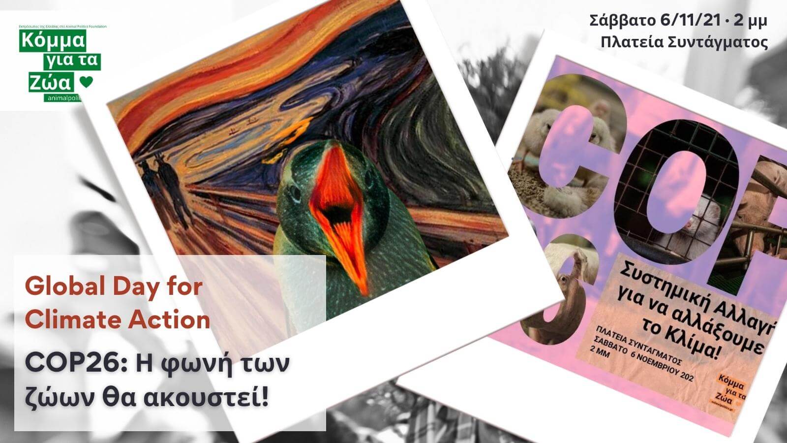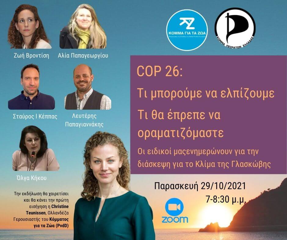 Το ελληνικό Κόμμα για τα Ζώα και το Κόμμα Πειρατών Ελλάδας συνδιοργανώνουν εκδήλωση για τη διάσκεψη του ΟΗΕ για το Κλίμα στη Γλασκώβη (COP26), με τη συμμετοχή της Ολλανδέζας Γερουσιαστού Κριστίν Τέινισεν και πέντε κορυφαίων Ελλήνων ειδικών