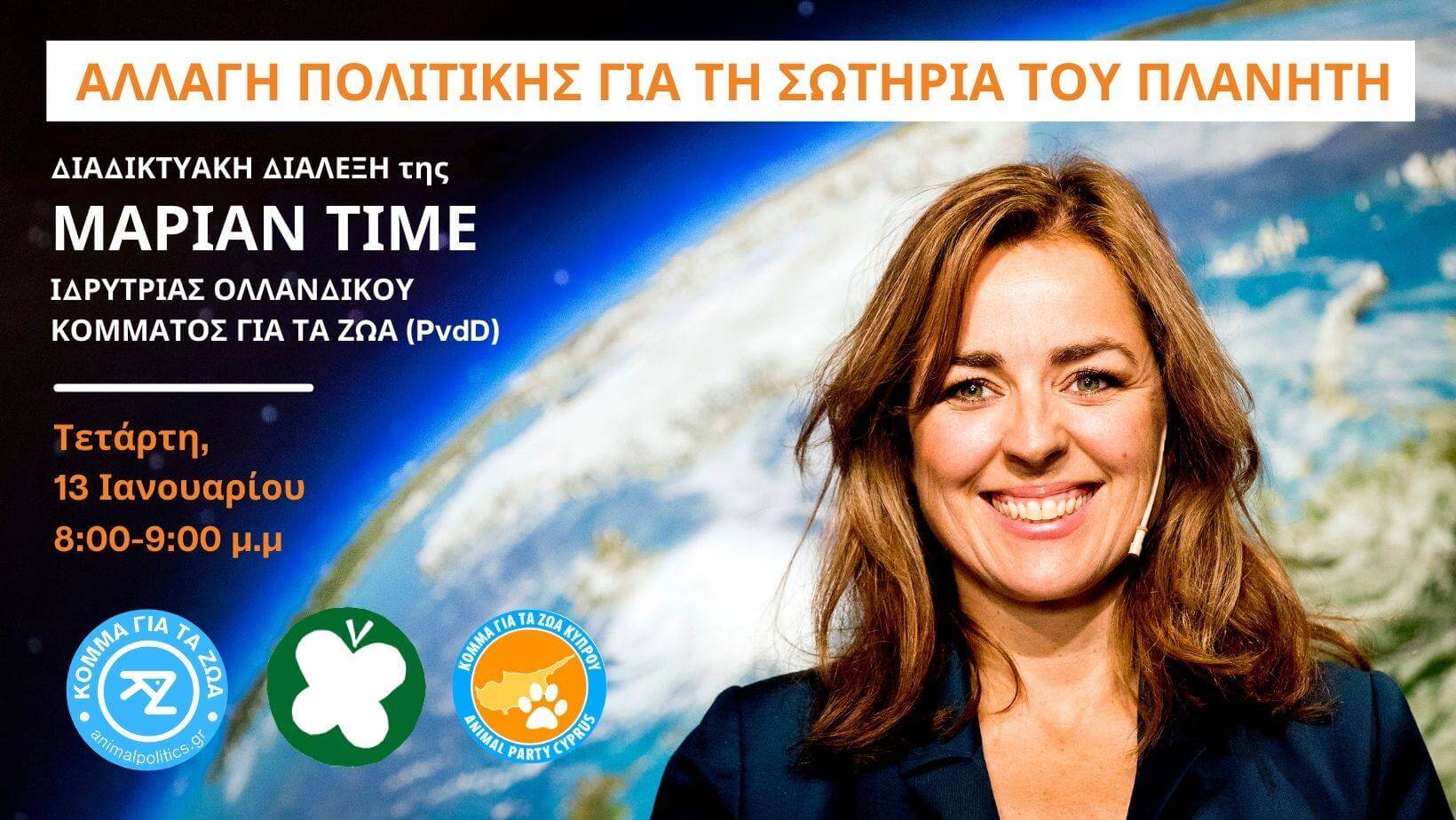 Με την ευκαιρία του Ιδρυτικού Συνεδρίου του Κόμματος για τα Ζώα, η Μαριάν Τίμε, ιδρύτρια του πιο πετυχημένου κόμματος της Πολιτικής Φιλοζωίας, μας μιλάει με θέμα «Αλλαγή πολιτικής, για τη σωτηρία του Πλανήτη»
