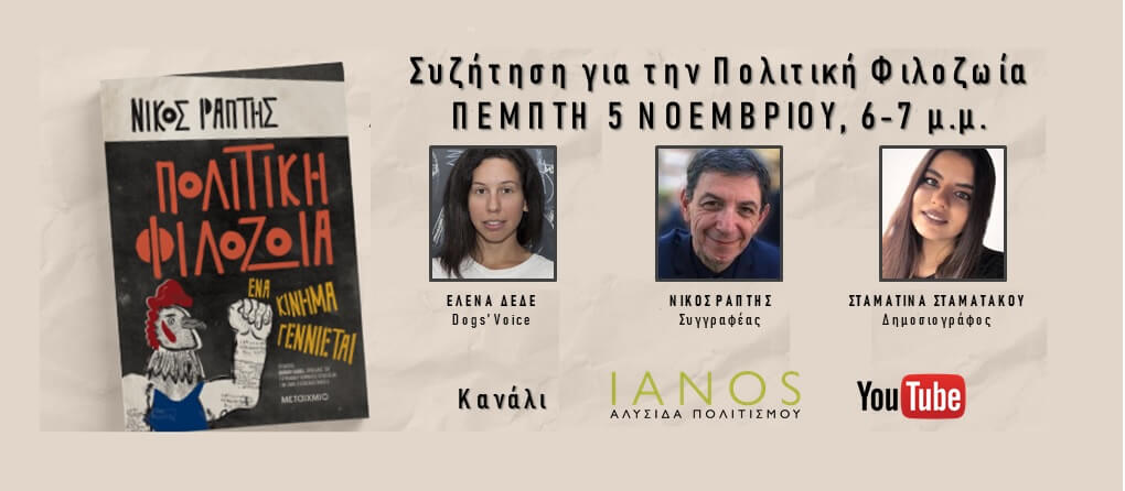 Το βίντεο της συζήτησης που διοργάνωσαν ο Ιανός και οι Εκδόσεις Μεταίχμιο για το βιβλίο Πολιτική Φιλοζωία. Η δημοσιογράφος Σταματίνα Σταματάκου συντονίζει τη συζήτηση του εκπαιδευτικού Νίκου Ράπτη με τη νομικό και ιδρύτρια του Dogs' Voice Έλενα Δέδε για τη σχέση της φιλοζωίας με την πολιτική