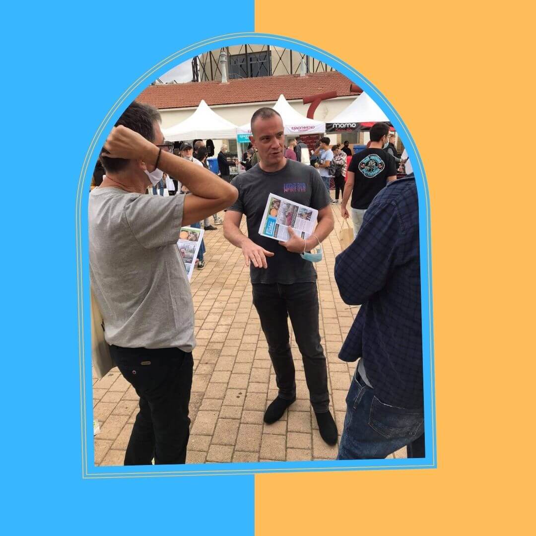 Τα μέλη του ΚΓΤΖ Ελένη Κλήμη, Φρανκ Μάγερ, Νίκος Ράπτης και Αστραδενή-Μαρία Σκούρτα επισκέπτονται τις/τους εκθέτες του VLF και τις/τους ενημερώνουν για την ίδρυση του κόμματος