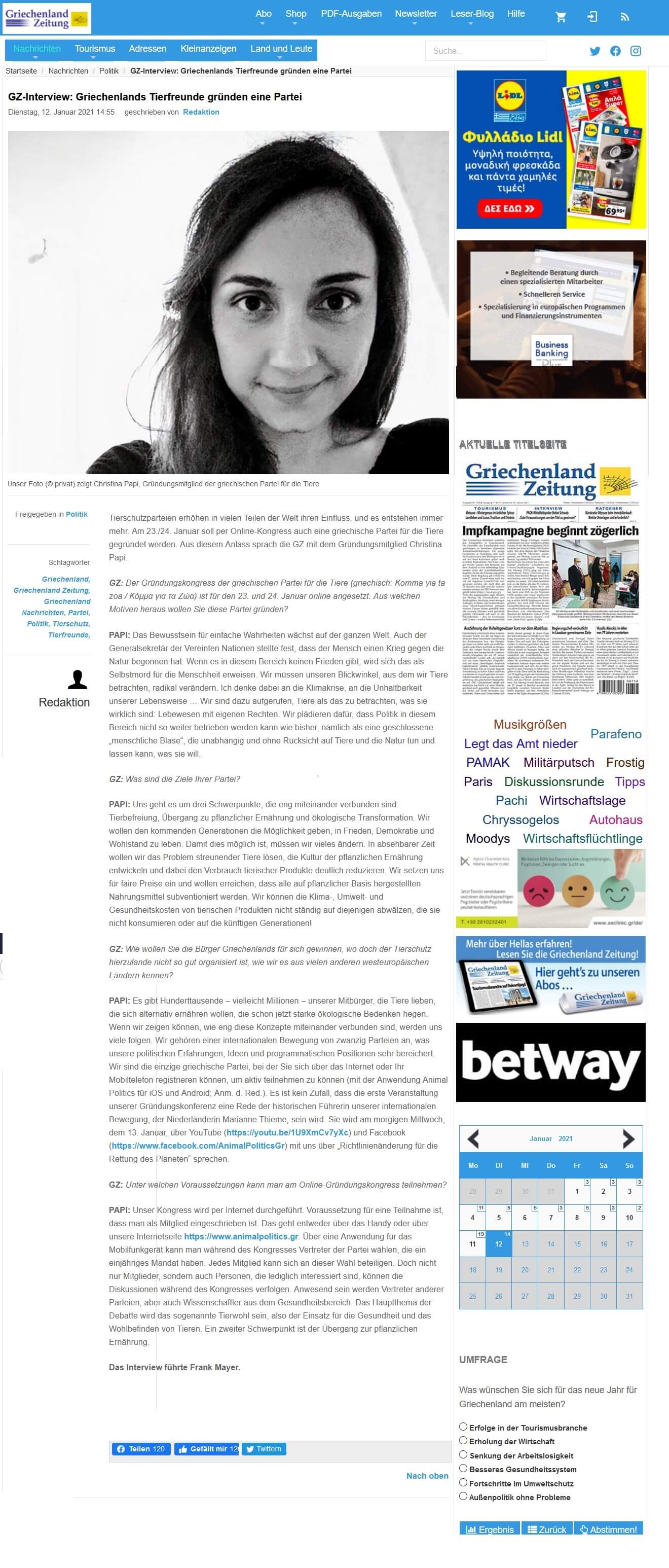 Ακολουθεί η μετάφραση της συνέντευξης της εκπροσώπου του ελληνικού Κόμματος για τα Ζώα, Χριστίνας Παπή: