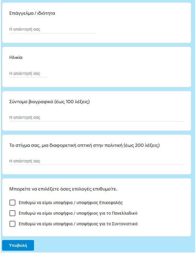 H φόρμα στην οποία μπορείτε να δηλώσετε την υποψηφιότητά σας