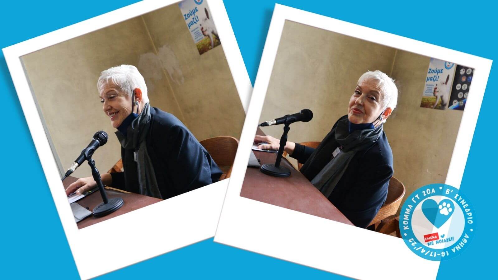 Ακολούθησε ο χαιρετισμός της γνωστής ηθοποιού Άννας Αδριανού, που εξέφρασε την υποστήριξή της στους φιλοζωικούς αγώνες του ελληνικού Κόμματος για τα Ζώα.