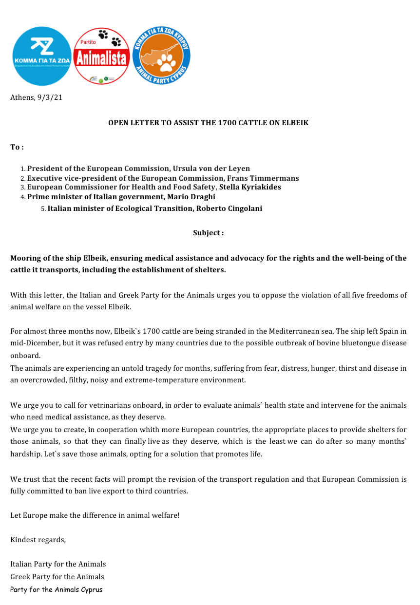 Στην επιστολή τους, ζητούν από τις αρχές να προστατεύσουν τις πέντε ελευθερίες των ζώων που μεταφέρει το πλοίο Ελμπεΐκ, που βιώνουν μια ανείπωτη τραγωδία, υποφέροντας από φόβο, αγωνία, πείνα, δίψα και αρρώστιες σε έναν υπερπλήρη, βρώμικο, θορυβώδη και με ακραίες θερμοκρασίες, χώρο.