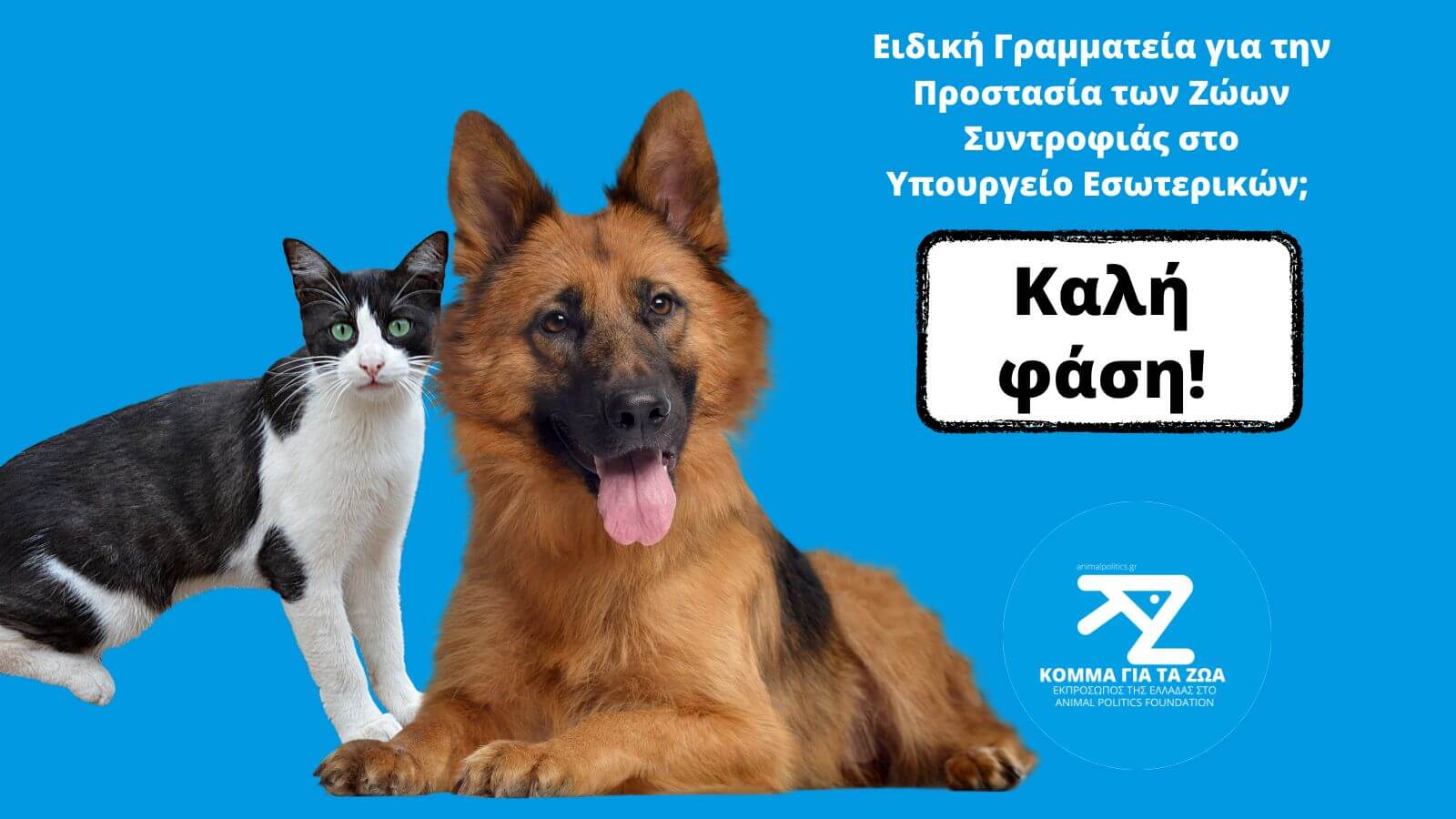 Το ελληνικό Κόμμα για τα Ζώα θεωρεί πως η δημιουργία μίας Γενικής Γραμματείας για τα ζώα συντροφιάς δίνει ελπίδες για την εφαρμογή των φιλοζωικών προνοιών της νομοθεσίας...