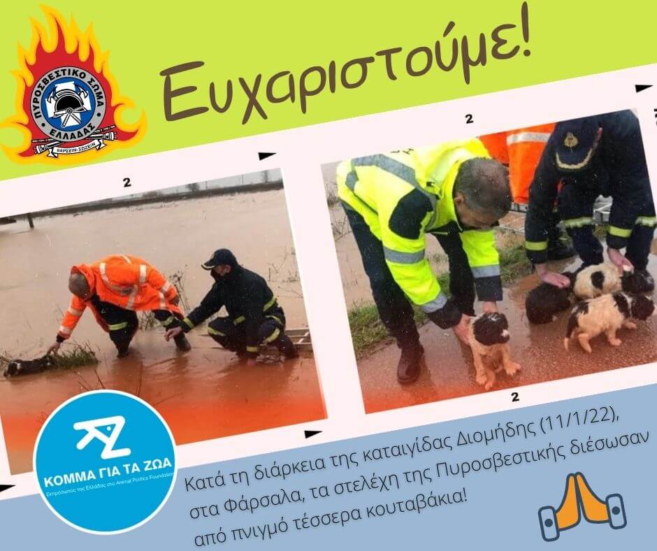 Δημοσία συγχαρητήρια και ευχαριστήρια προς το Πυροσβεστικό Σώμα Ελλάδας εξέφρασε το ελληνικό Κόμμα για τα Ζώα. Την Τρίτη 11/1/2022, στο Κατωχώρι Φαρσάλων, κατά τη διάρκεια της καταιγίδας «Διομήδης», πυροσβέστες διέσωσαν από πνιγμό τέσσερα κουταβάκια.