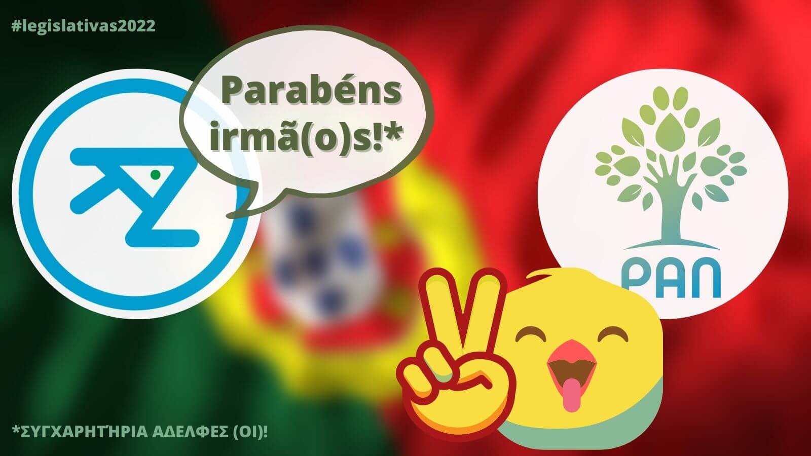 To μήνυμα του ελληνικού Κόμματος για τα Ζώα προς το πορτογαλικό αδελφικό κόμμα ΡΑΝ, για την επανεκλογή του στο Εθνικό Κοινοβούλιο στη Λισαβώνα.