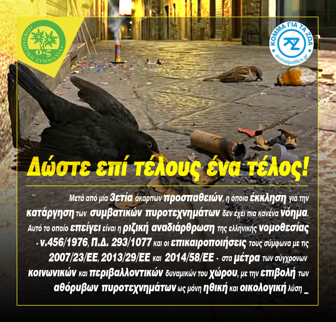 H ΟΙΚΟΛΟΓΙΚΗ ΣΥΜΜΑΧΙΑ και το Κόμμα για τα Ζώα για την επιτακτική ανάγκη αναδιάρθρωσης της νομοθεσίας για τα πυροτεχνήματα