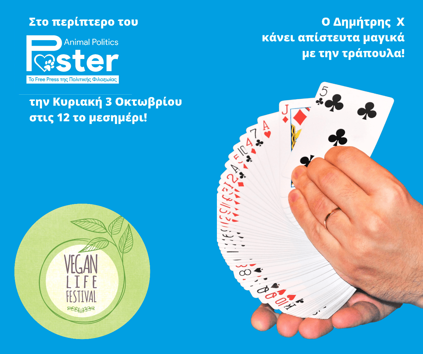 Την Κυριακή, ο Δημήτρης Μαύρος (alias Dimitri X) διασκέδασε τους επισκέπτες του περιπτέρου μας με ταχυδακτυλουργικά κόλπα! Σημαντική ήταν η παρουσία του vegan chef Νίκου Γαϊτάνου, που είχε την γενναιοδωρία να διανείμει δωρεάν και να υπογράψει διακόσια αντίτυπα που κλασικού του βιβλίου «My Vegan Workshop Recipes». Περιττό να πούμε πως σχηματίστηκαν ουρές στο περίπτερο και τα βιβλία «έφυγαν» σε λιγότερο από σαράντα λεπτά!
