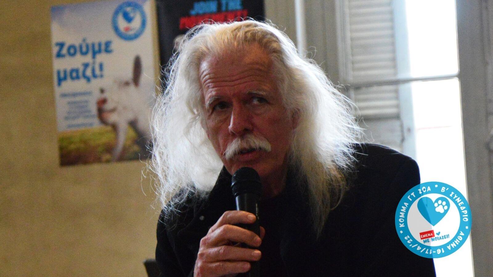 Ακολούθησε ο χαιρετισμός του τιμώμενου προσκεκλημένου του Συνεδρίου, του γνωστού μουσικού και μαχητή για τη Φύση και τα Ζώα Ρος Ντέιλι, που ήρθε από την Κρήτη για να συμμετέχει στο Συνέδριό μας. Ο Ρος μας μίλησε με γνώση και συναίσθημα για την υποχρέωση των ανθρώπων να φροντίζουμε τη φύση και να προστατεύουμε όλα τα άλλα ζώα, αντί να ασκούμε επάνω τους μια άμυαλη -και αυτοκτονική εντέλει- κυριαρχία.