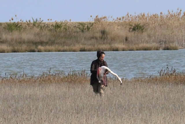 Εθελόντρια περισυλλέγει φλαμίνγκο δηλητηριασμένα από σκάγια στο Εθνικό Πάρκο του Αξιού (φωτογραφίες: Δράση για την Άγρια Ζωή)